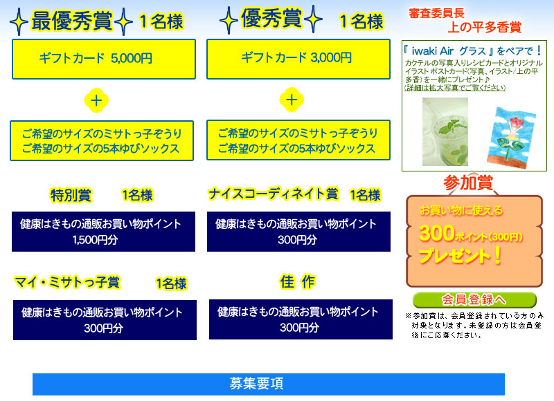 当サイト【足元気の会】会員の方は、応募時に、会員IDまたは会員登録したメールアドレスを書き添えていただくと、参加賞として300ポイントを進呈します。ポイントの付与は、おひとりにつき1回とさせていただきます。